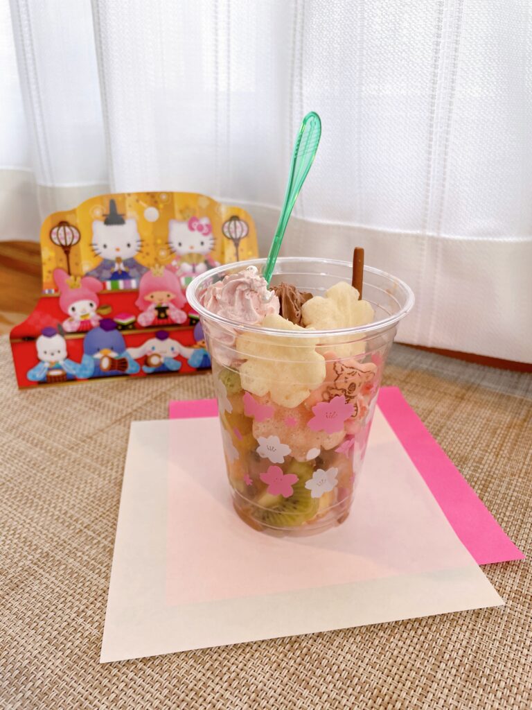 春らしい桜柄のカップを使って、オリジナルパフェ作りのスタートです❣